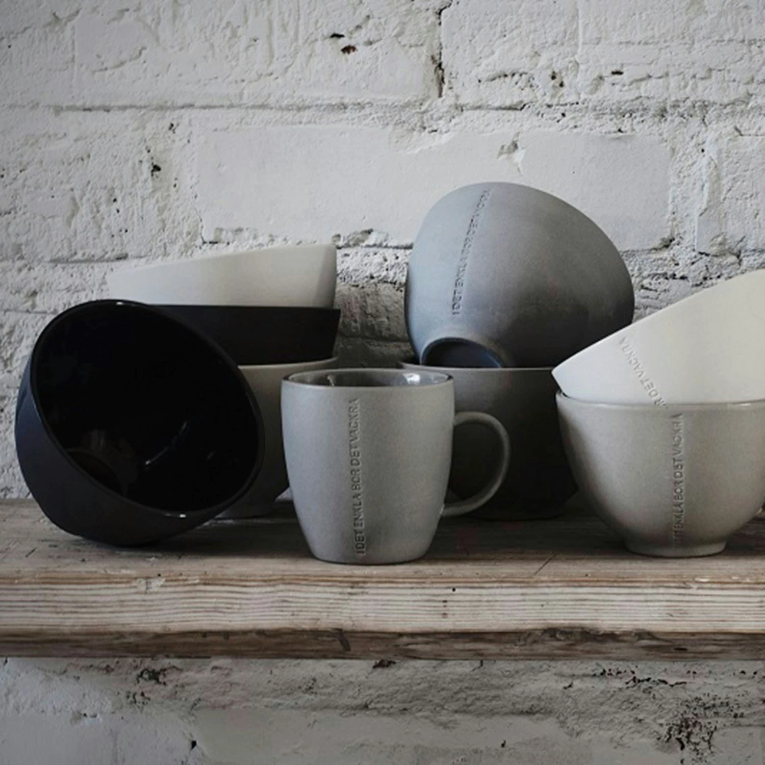 Schüssel von Ernst Kirchsteiger mit dem Zitat „I det enkla bor det vackra“. Dasselbe Zitat ist auf einer Vielzahl von Bechern, Krügen und Schalen von Ernst vermerkt. Mit dieser einfachen Steinzeugschüssel in wunderschönen, stumpfen Farben kannst du deinem Zuhause einen zusätzlichen gemütlichen Faktor verleihen.