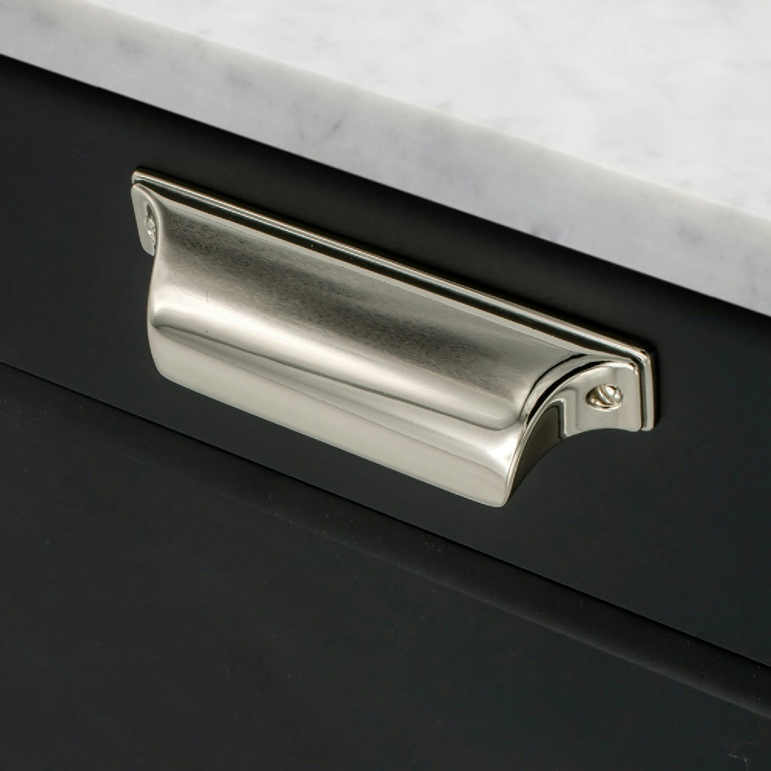 Timjan Muschelgriff von Beslag Design. Eine stilvolle und zeitlose Armatur im Retro-Stil, die sich ideal für Küchenschränke, Kommoden und andere Laden eignet. Wähle zwischen dem vernickeltem oder schwarzem Griff.
